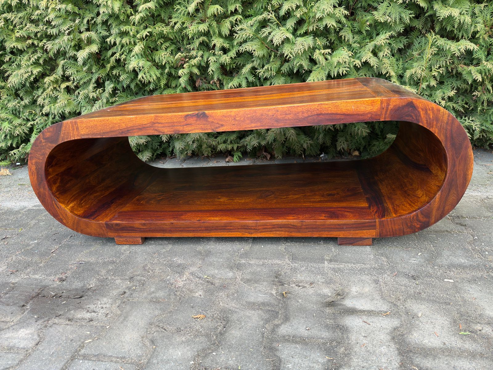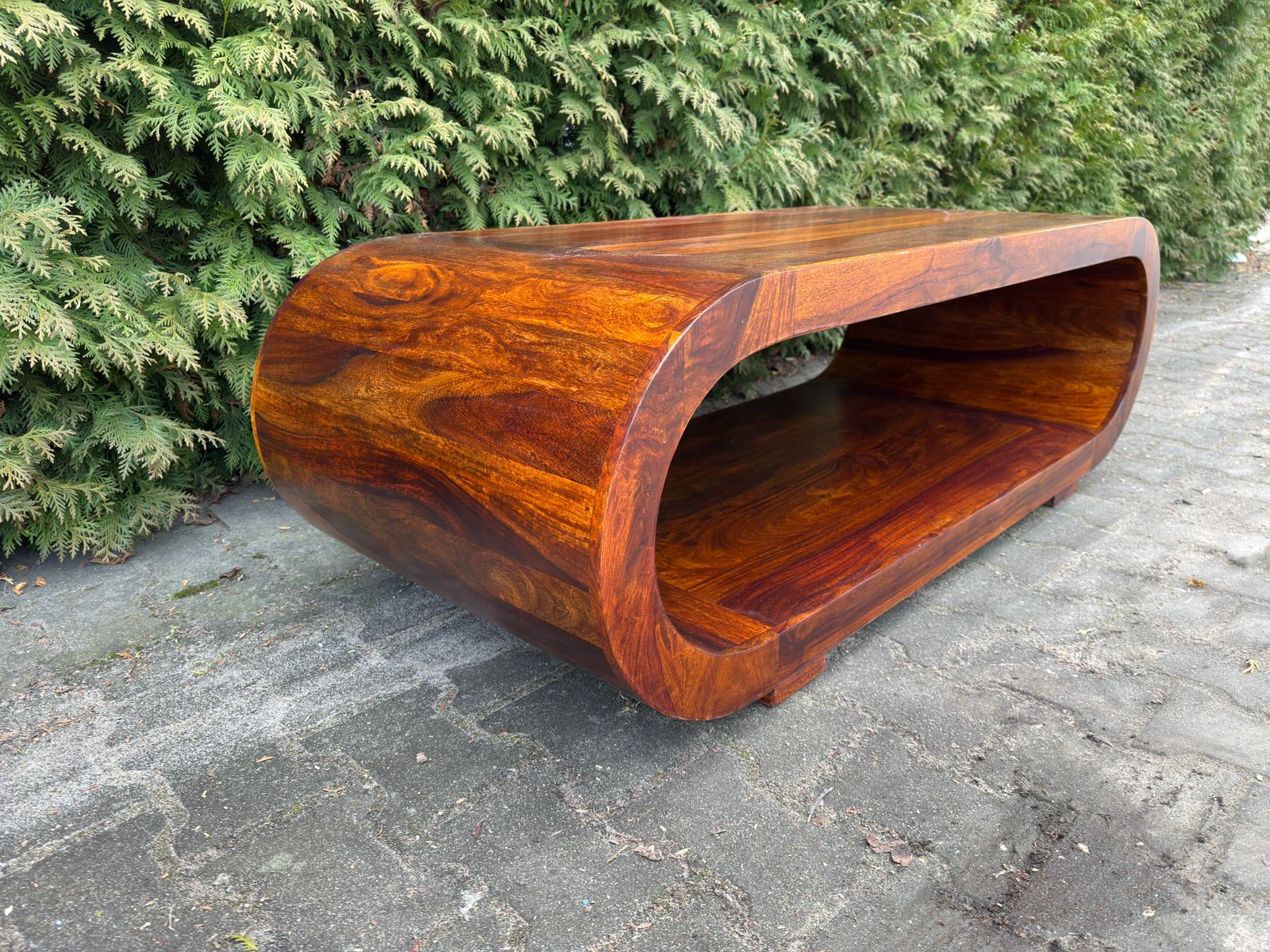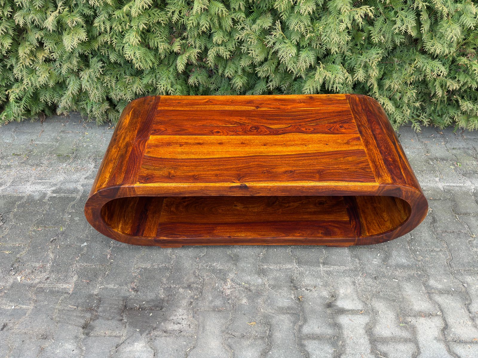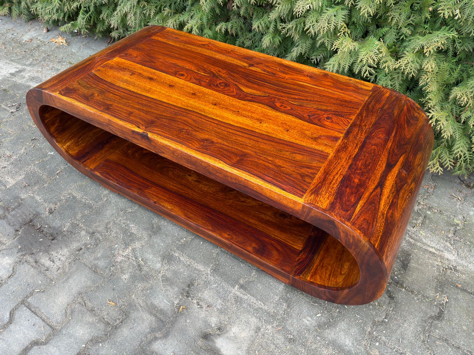 Indyjski drewniany stolik, wykonany ręcznie z litego drewna palisandru indyjskiego. Naturalne usłojenie zostało podkreślone miodowym wybarwieniem.