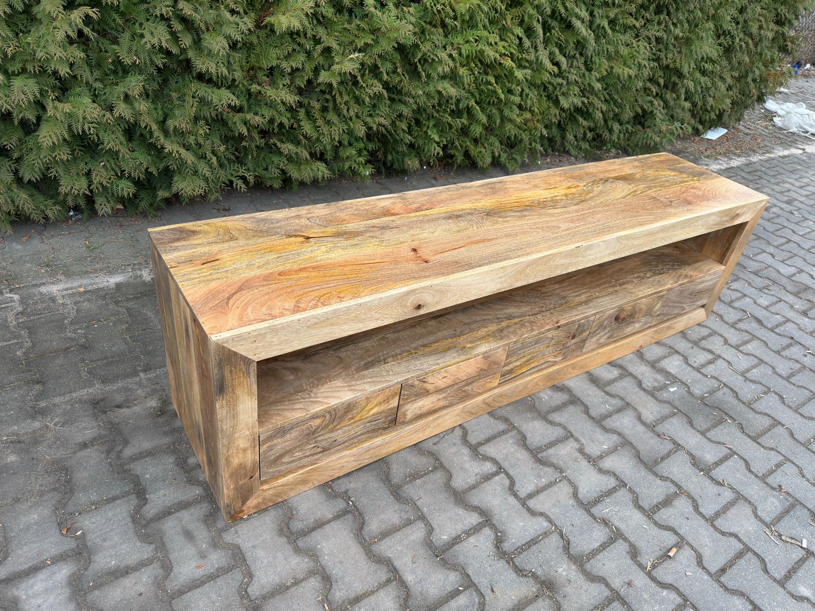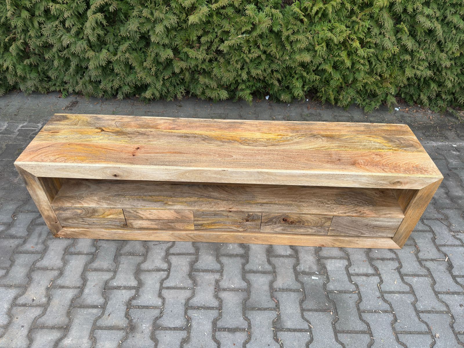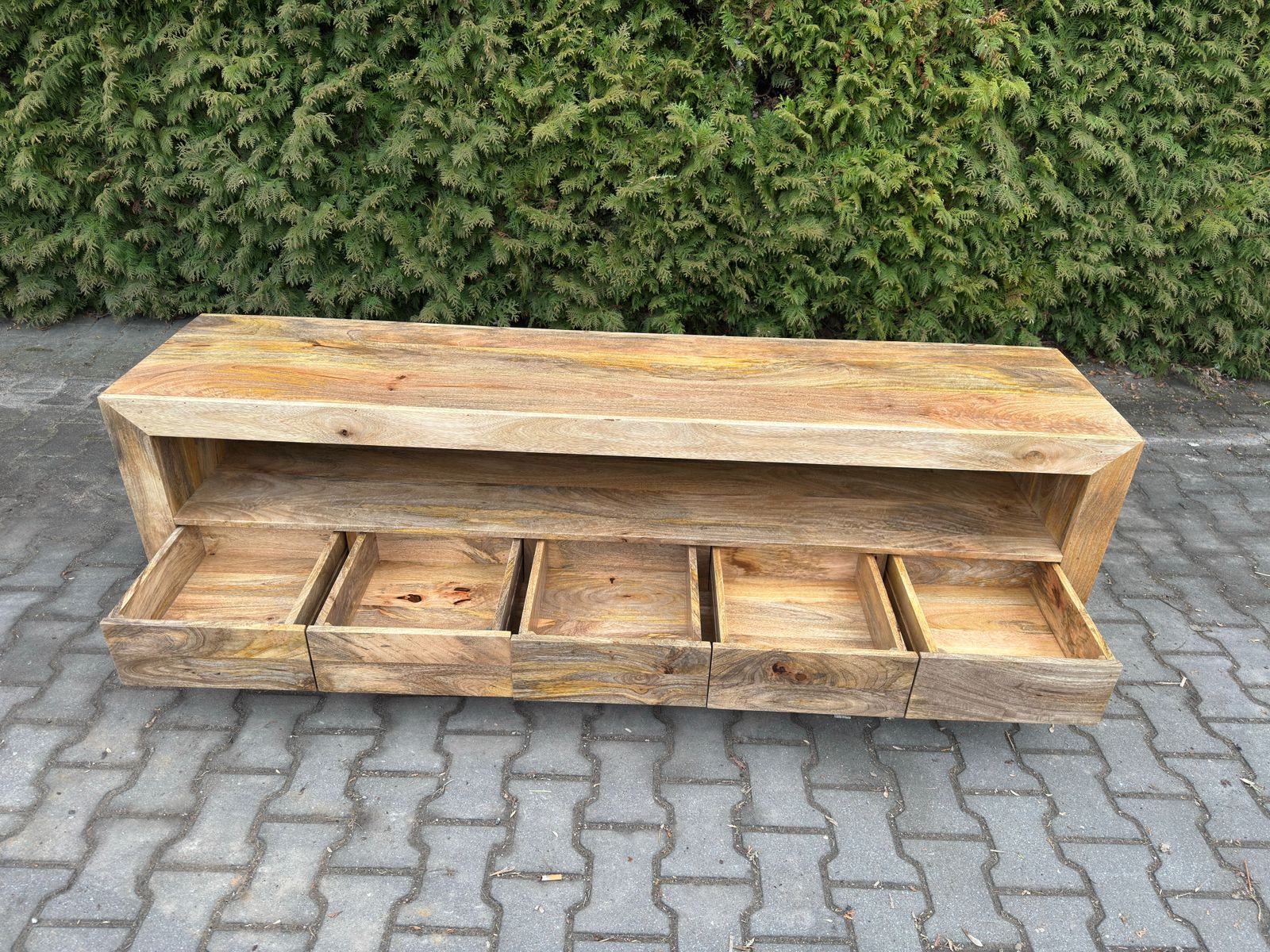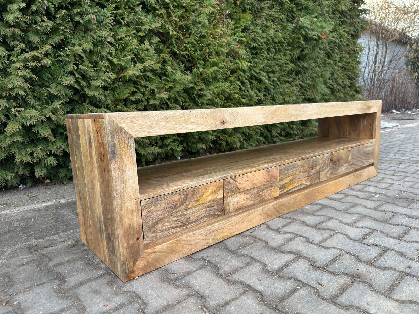 Nowoczesna indyjska komoda RTV wykonana ręcznie z egzotycznego drewna. Mebel o klasycznej formie, wyprodukowany w całości z indyjskiego drewna mangowca, będzie idealnym dopełnieniem zarówno klasycznych, jak i nowoczesnych wnętrz. Do dyspozycji mamy pięć szuflad, przestrzeń na sprzęt RTV oraz powierzchnię blatu. Prosta forma perfekcyjnie koresponduje z ciekawą kolorystyką, co zostało dodatkowo podkreślone bezbarwnym, półmatowym lakierem.