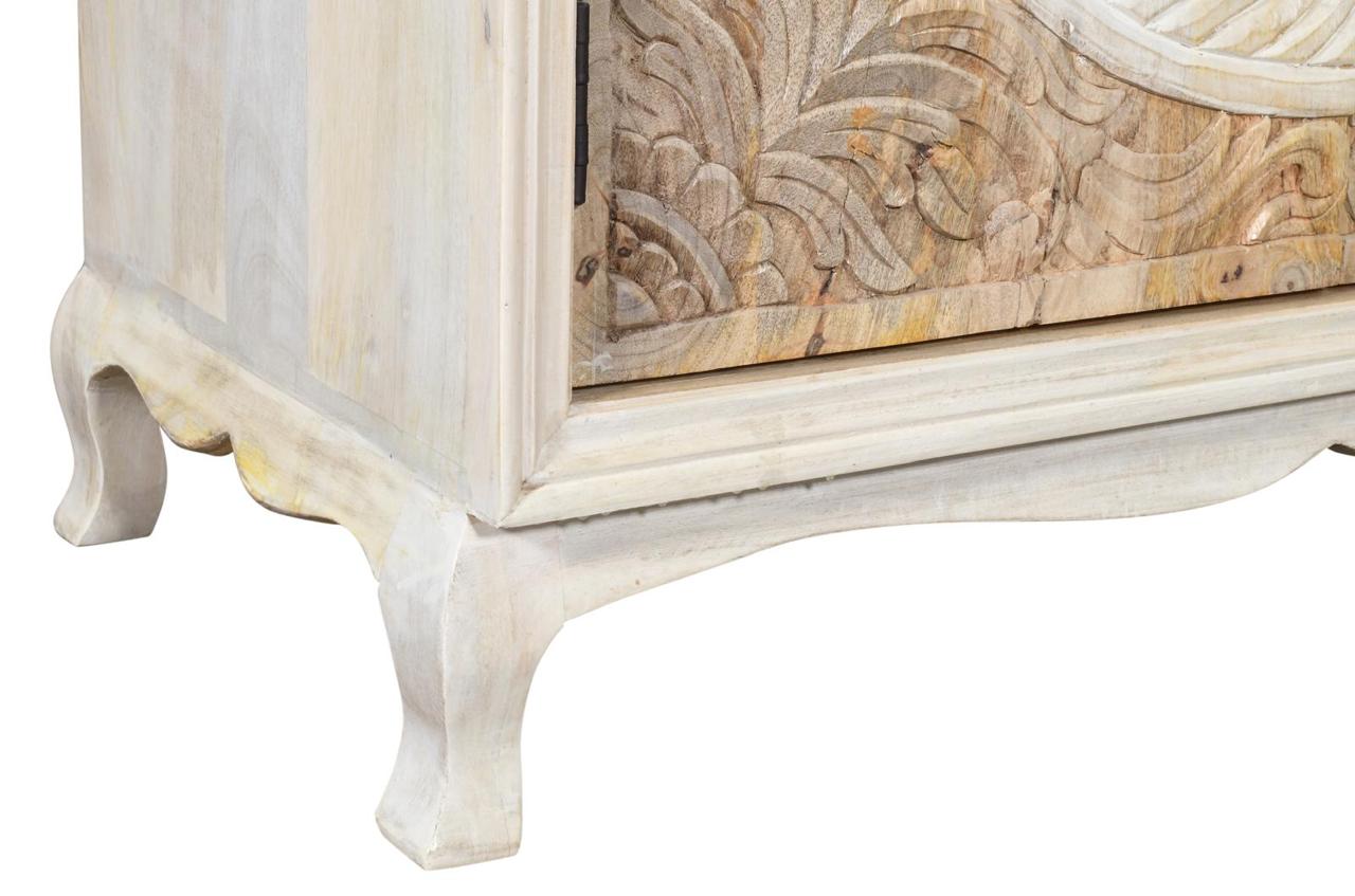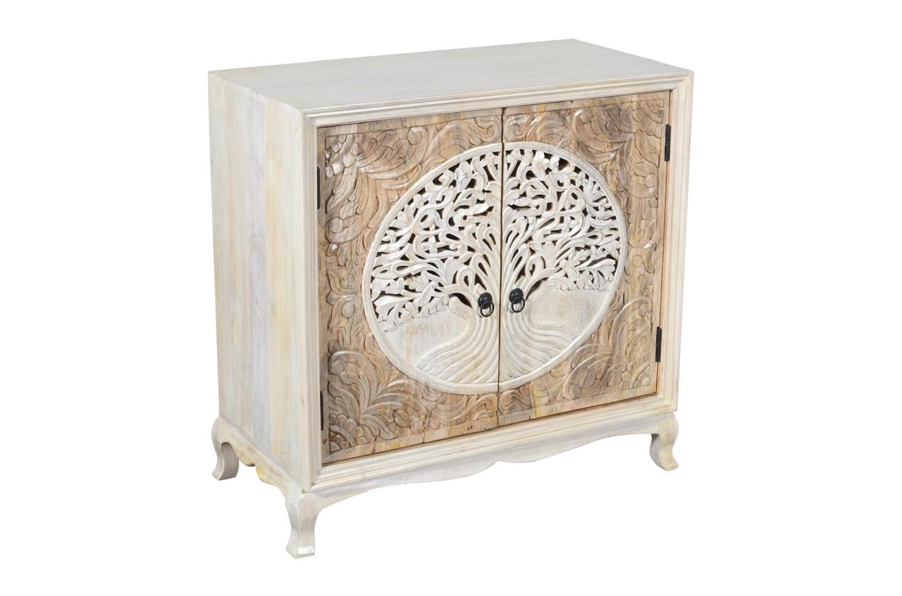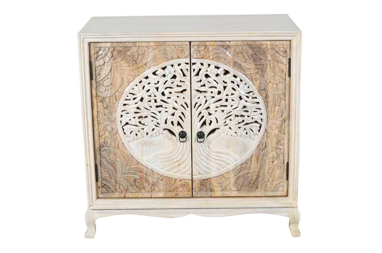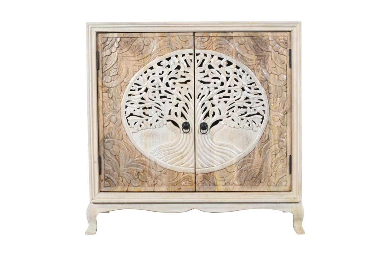 Komoda drewniana wykonana z drewna mango to wyjątkowy mebel, który łączy w sobie funkcjonalność z dekoracyjnym charakterem. Jej największym atutem są fronty zdobione efektownym motywem drzewa życia – precyzyjnie rzeźbiony wzór nadaje całości głębi i przyciąga uwagę, tworząc niepowtarzalny akcent we wnętrzu.