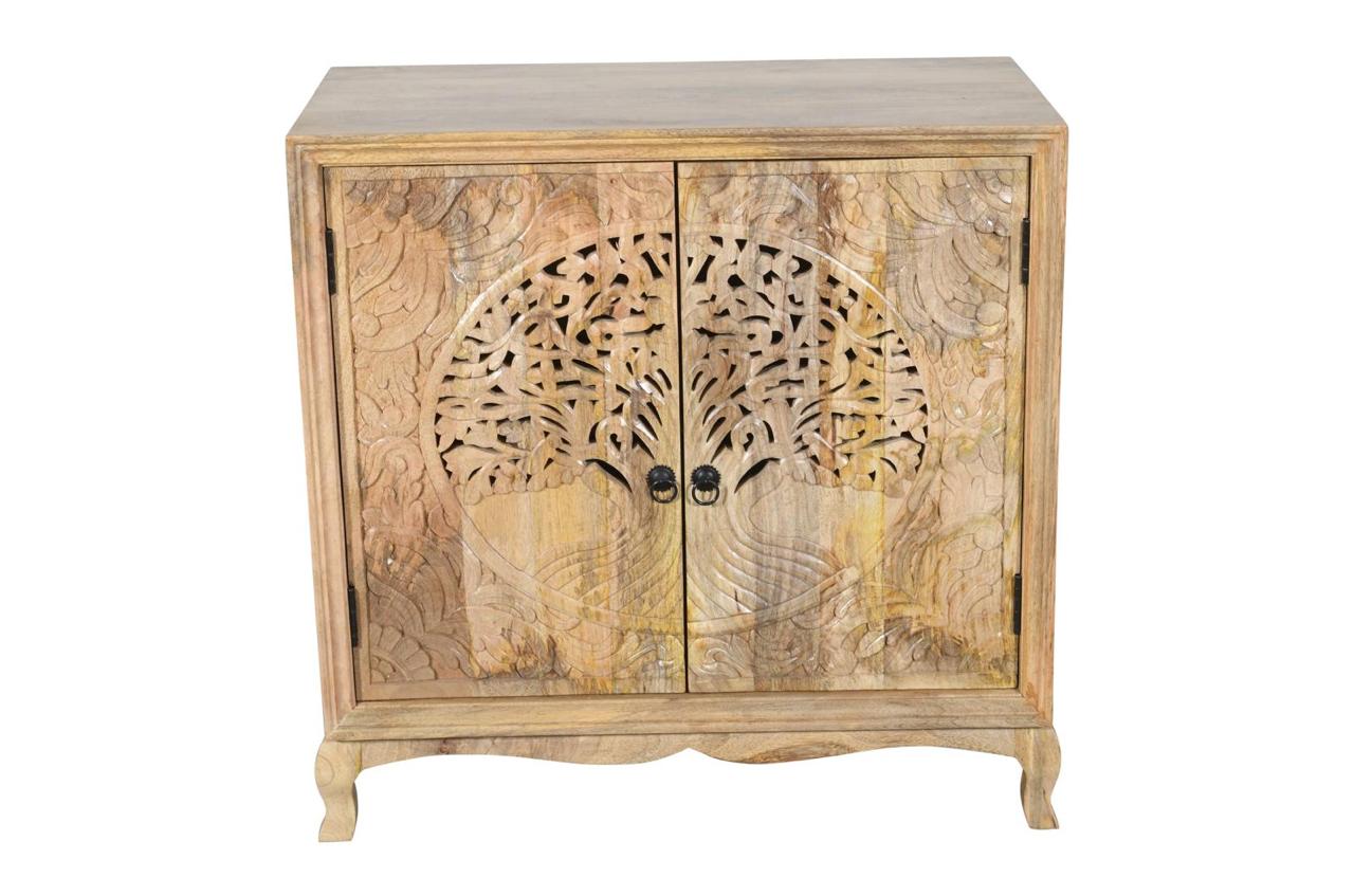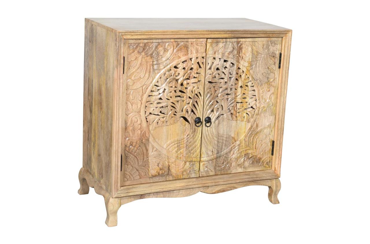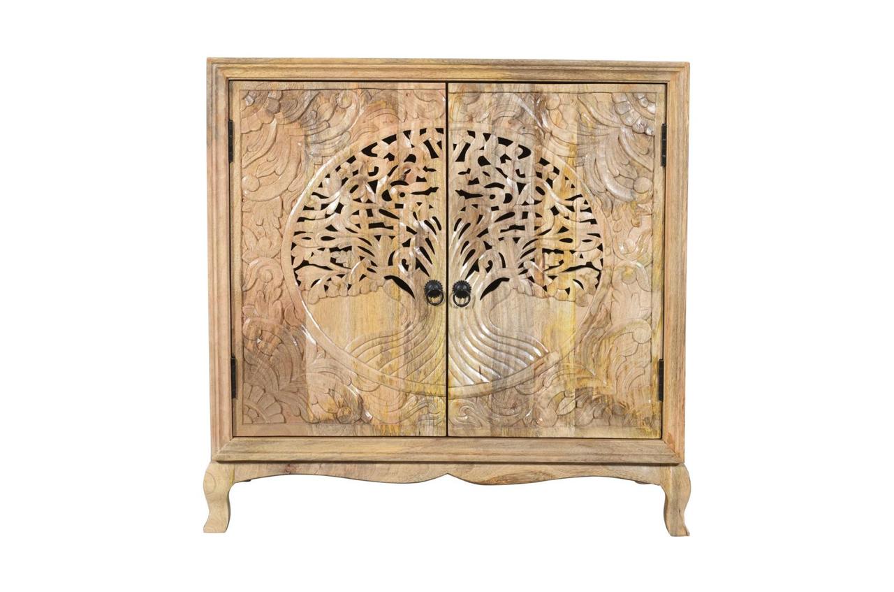 Komoda drewniana wykonana z drewna mango to wyjątkowy mebel, który łączy w sobie funkcjonalność z dekoracyjnym charakterem. Jej największym atutem są fronty zdobione efektownym motywem drzewa życia – precyzyjnie rzeźbiony wzór nadaje całości głębi i przyciąga uwagę, tworząc niepowtarzalny akcent we wnętrzu.