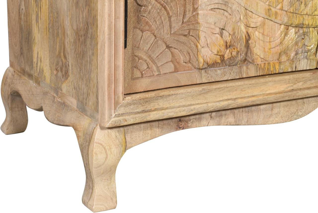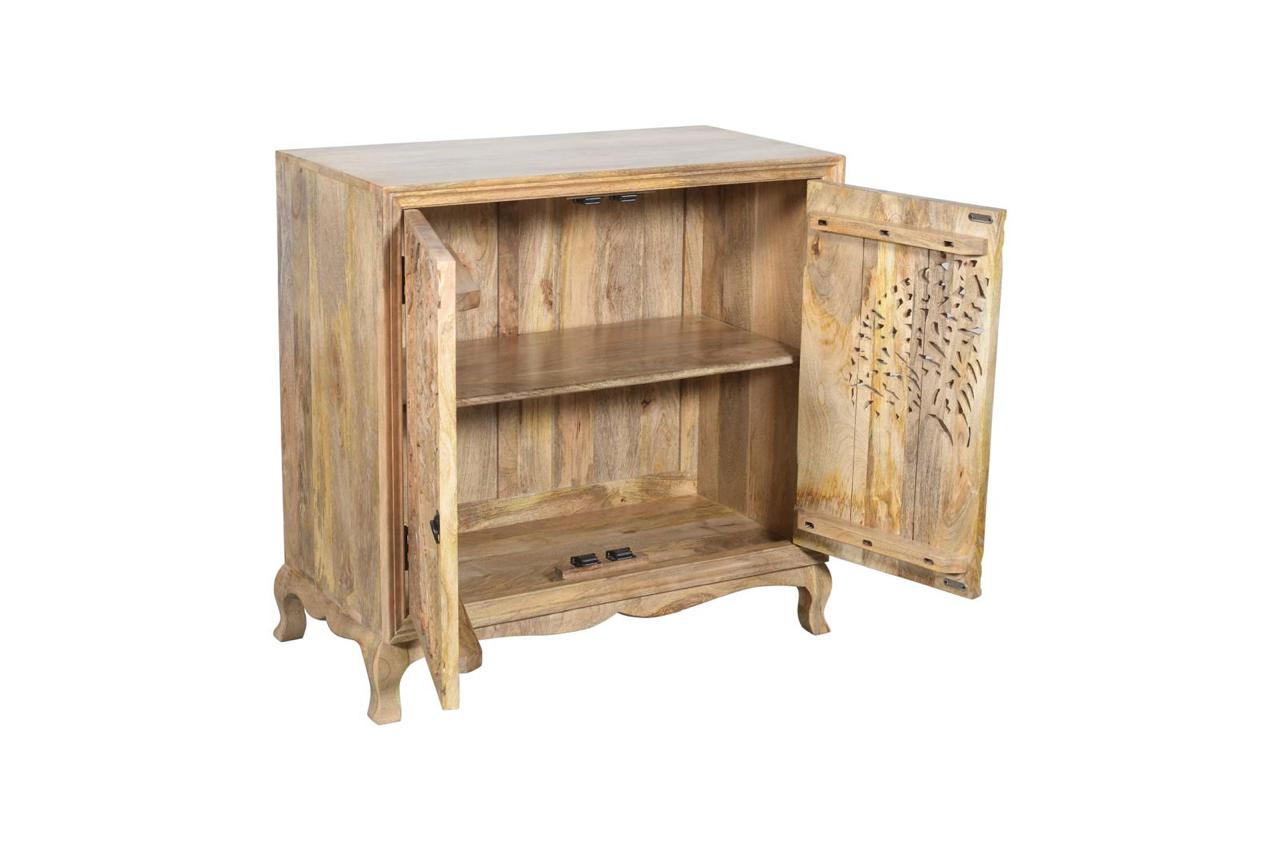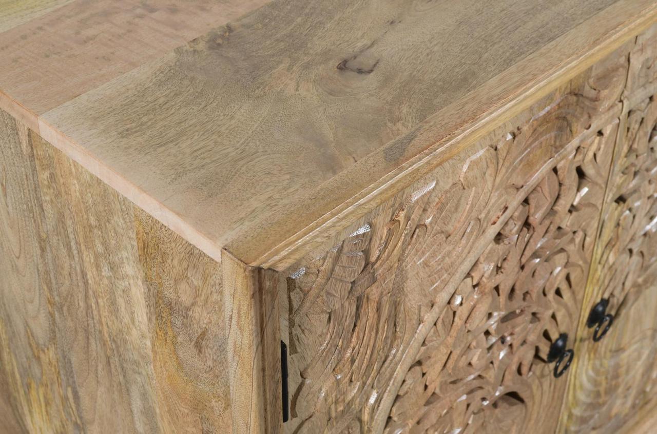 Komoda drewniana wykonana z drewna mango to wyjątkowy mebel, który łączy w sobie funkcjonalność z dekoracyjnym charakterem. Jej największym atutem są fronty zdobione efektownym motywem drzewa życia – precyzyjnie rzeźbiony wzór nadaje całości głębi i przyciąga uwagę, tworząc niepowtarzalny akcent we wnętrzu.