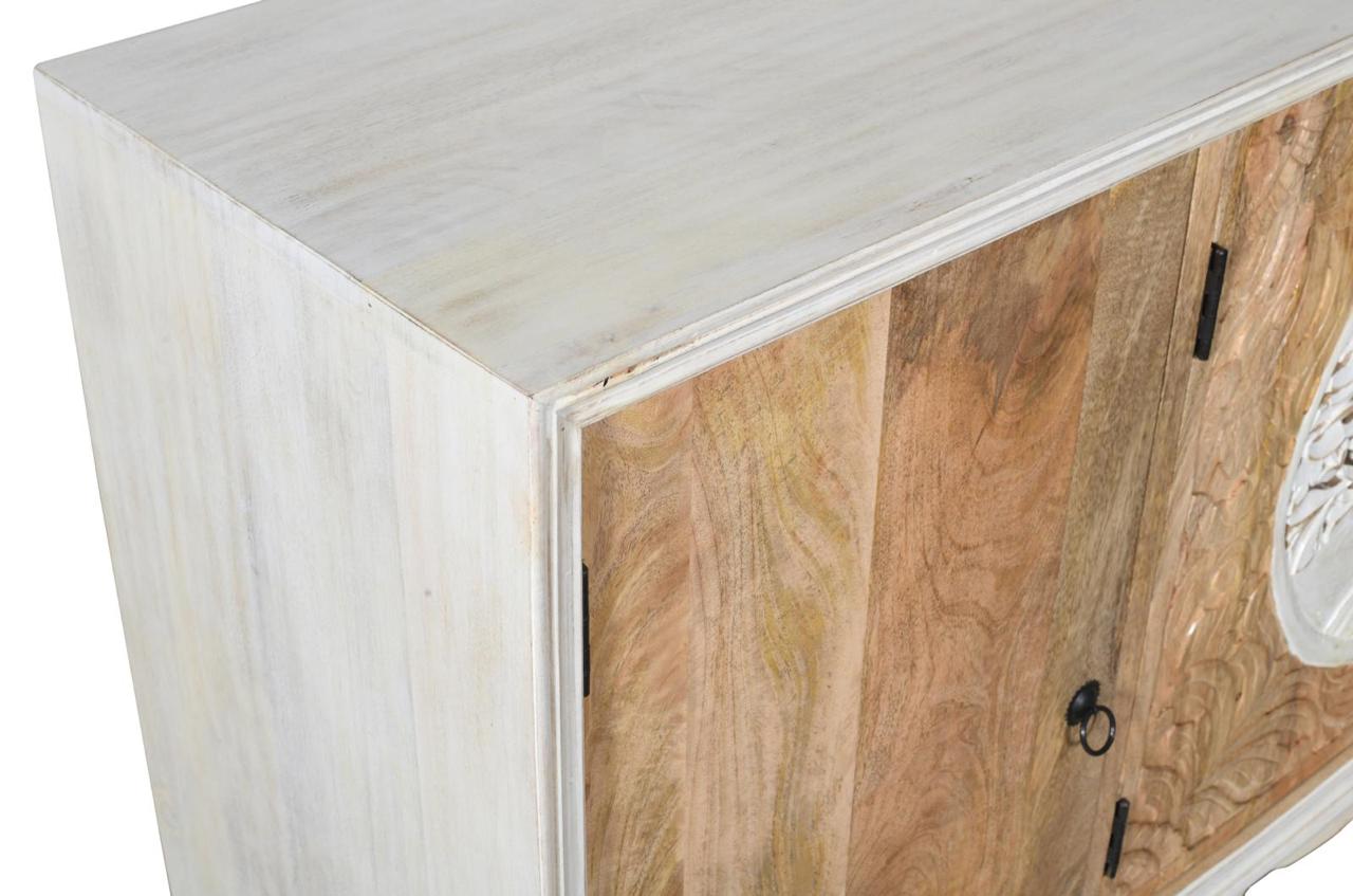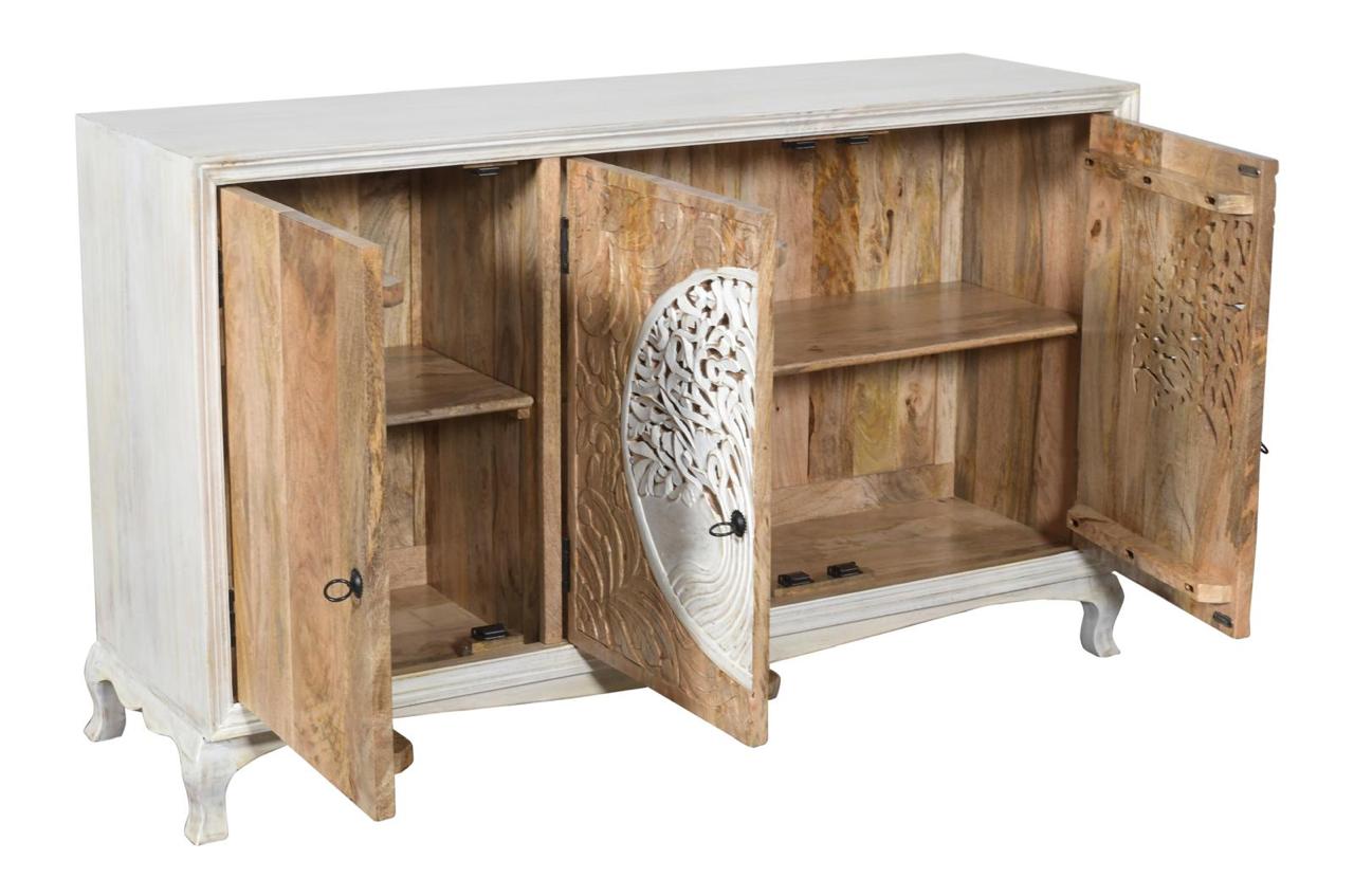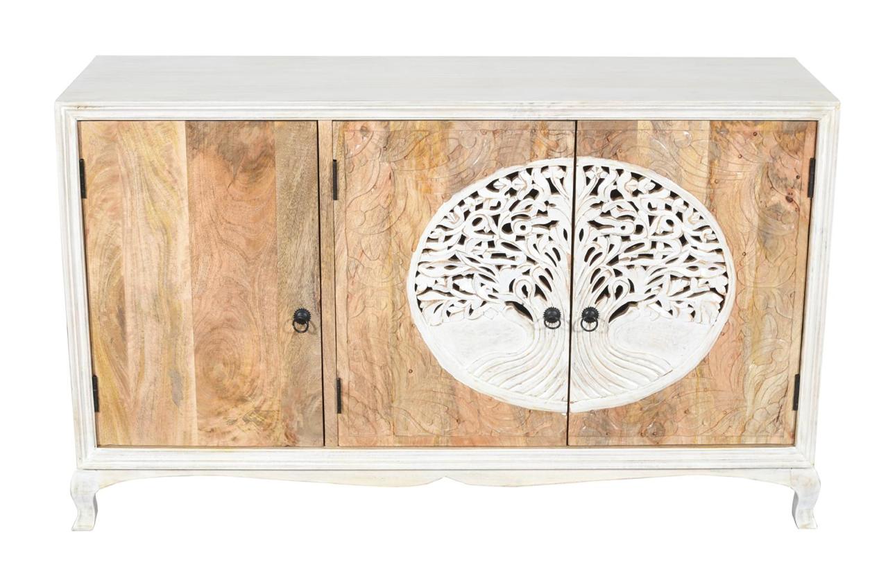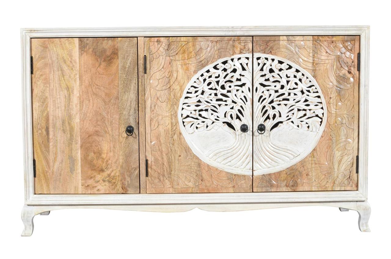 Komoda drewniana wykonana z drewna mango to wyjątkowy mebel, który łączy w sobie funkcjonalność z dekoracyjnym charakterem. Jej największym atutem są fronty zdobione efektownym motywem drzewa życia – precyzyjnie rzeźbiony wzór nadaje całości głębi i przyciąga uwagę, tworząc niepowtarzalny akcent we wnętrzu.
