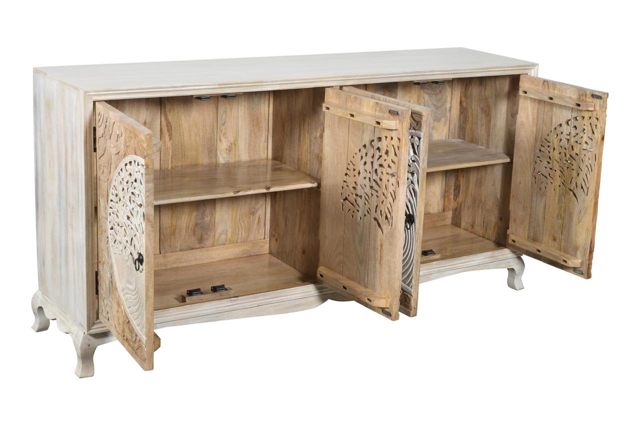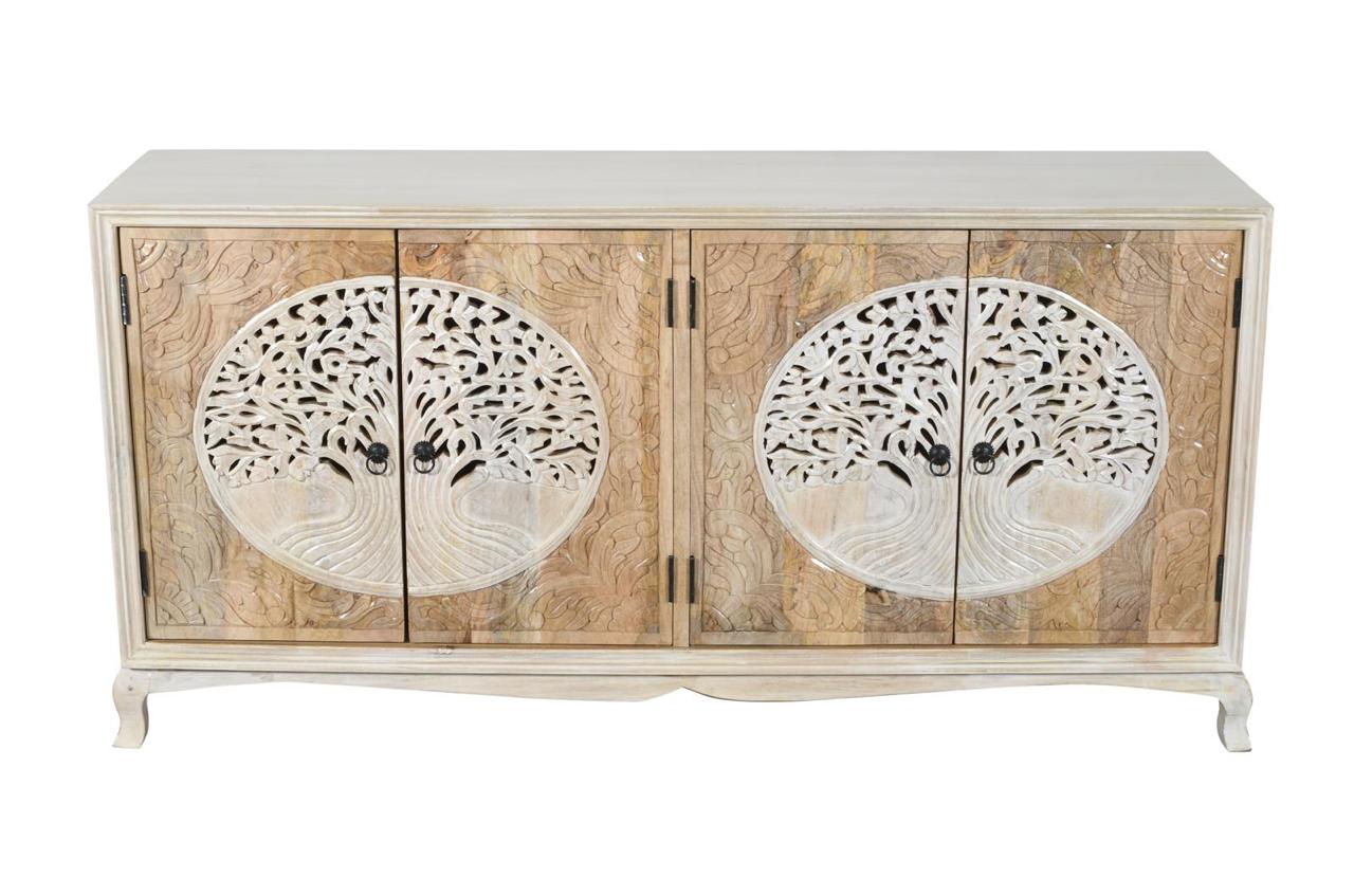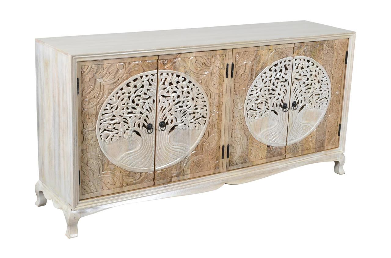 Komoda drewniana wykonana z drewna mango to wyjątkowy mebel, który łączy w sobie funkcjonalność z dekoracyjnym charakterem. Jej największym atutem są fronty zdobione efektownym motywem drzewa życia – precyzyjnie rzeźbiony wzór nadaje całości głębi i przyciąga uwagę, tworząc niepowtarzalny akcent we wnętrzu.