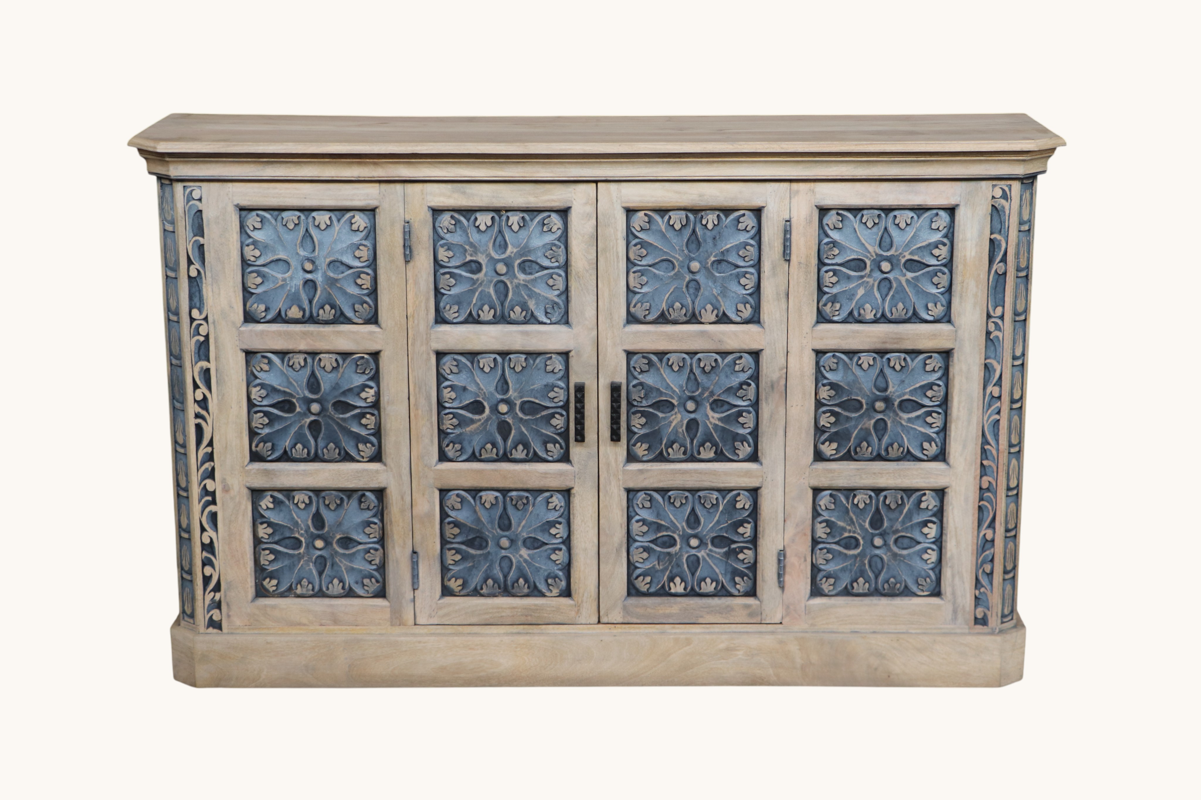 Front komody zdobią geometryczne, rzeźbione panele w niebieskawym odcieniu, które tworzą unikalny wzór i przyciągają uwagę. Dzięki szerokiej konstrukcji mebel oferuje dużo miejsca do przechowywania, idealnie sprawdzając się w salonie, jadalni lub sypialni.