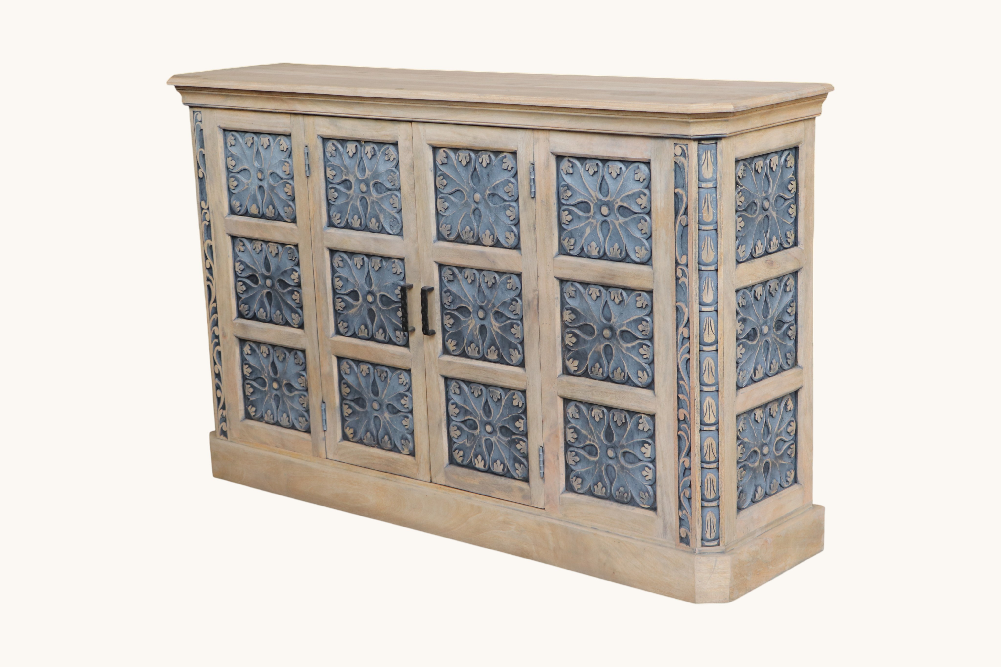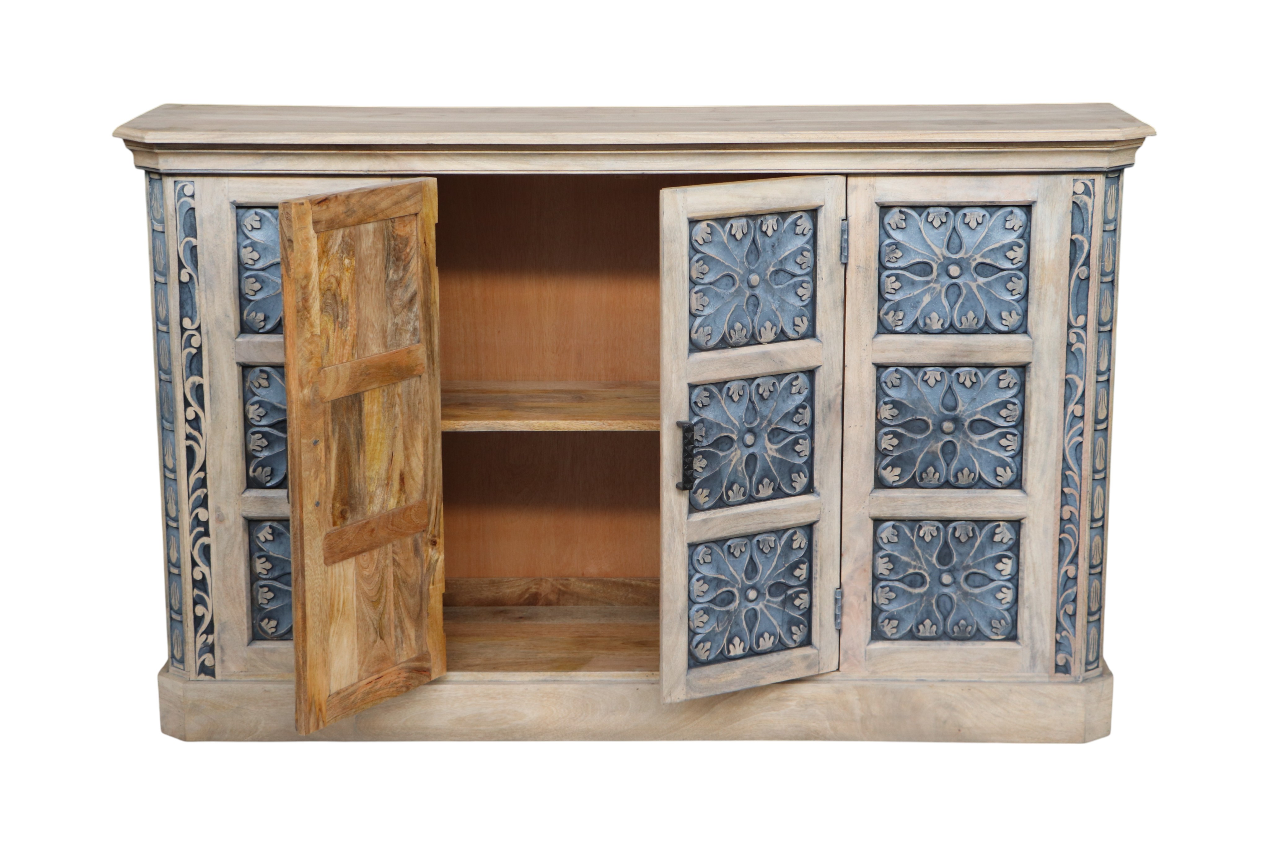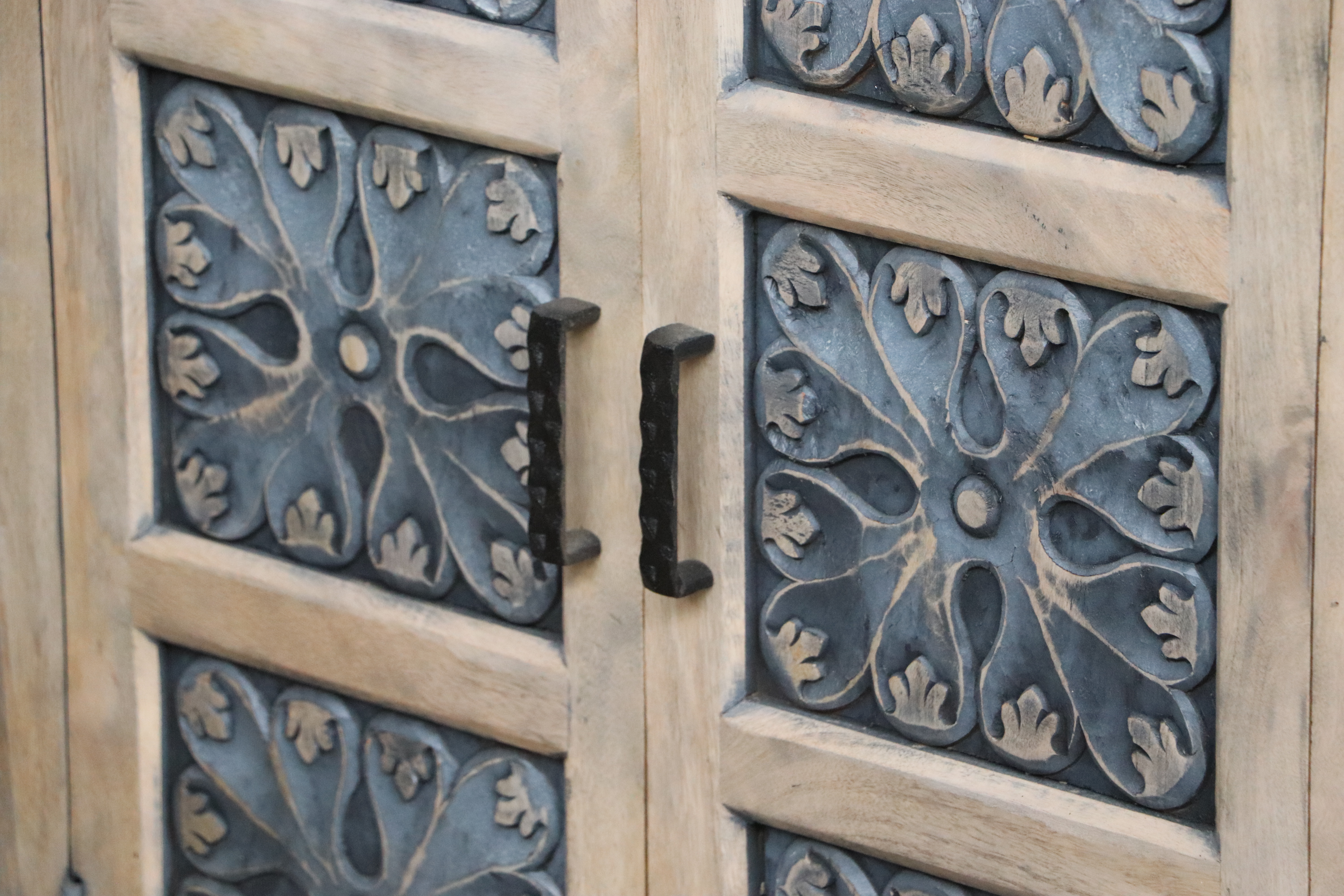Efektowna komoda wykonana z litego drewna mango, która łączy naturalne piękno materiału z dekoracyjnym, ręcznie rzeźbionym frontem. Jasne, lekko przecierane wykończenie podkreśla strukturę drewna i nadaje meblowi wyjątkowy, rustykalny charakter.