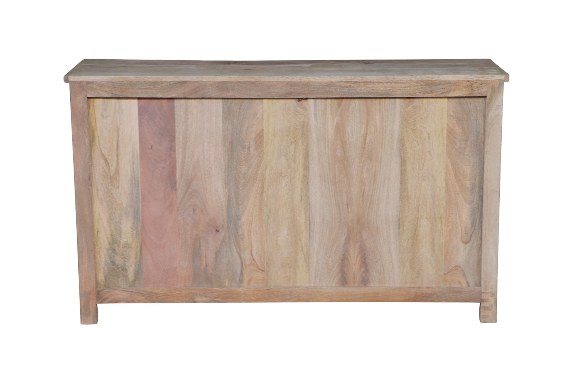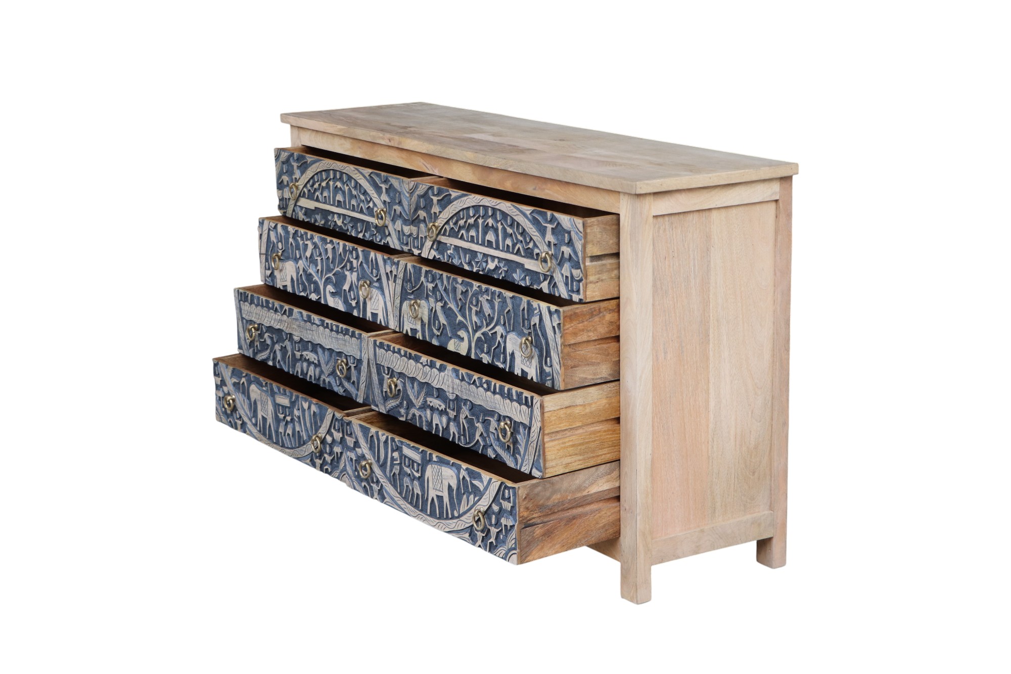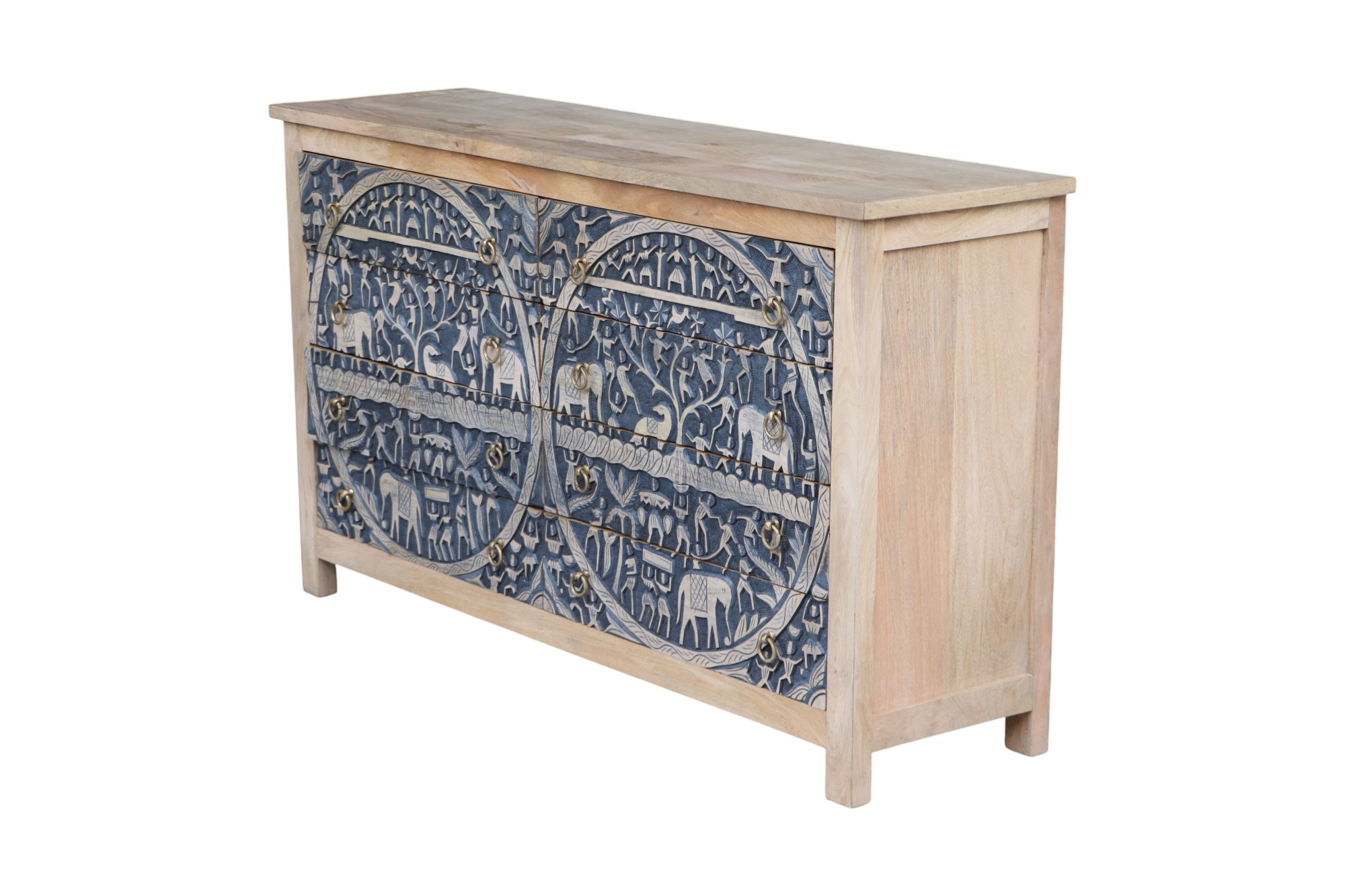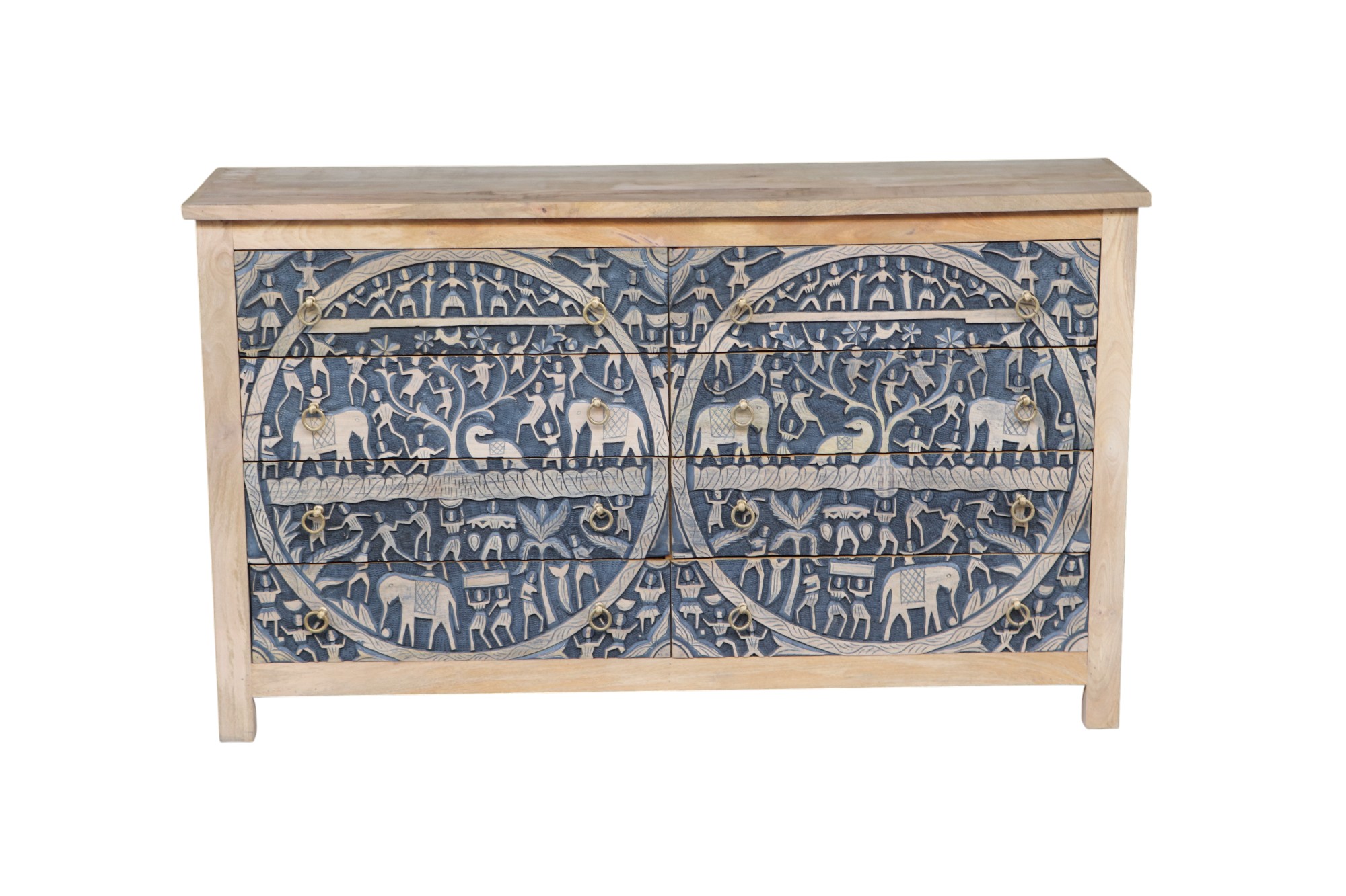 Efektowna komoda wykonana z litego drewna mango, wyróżniająca się bogato rzeźbionym frontem z dekoracyjnymi, okrągłymi motywami. Artystyczne wzory inspirowane naturą i tradycyjnym rzemiosłem nadają meblowi wyjątkowy, orientalny charakter.