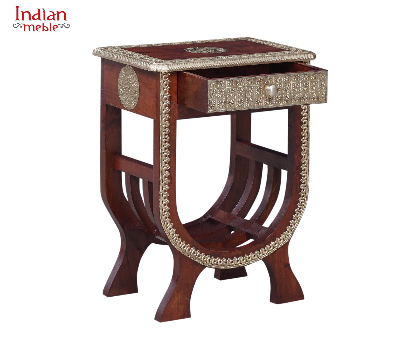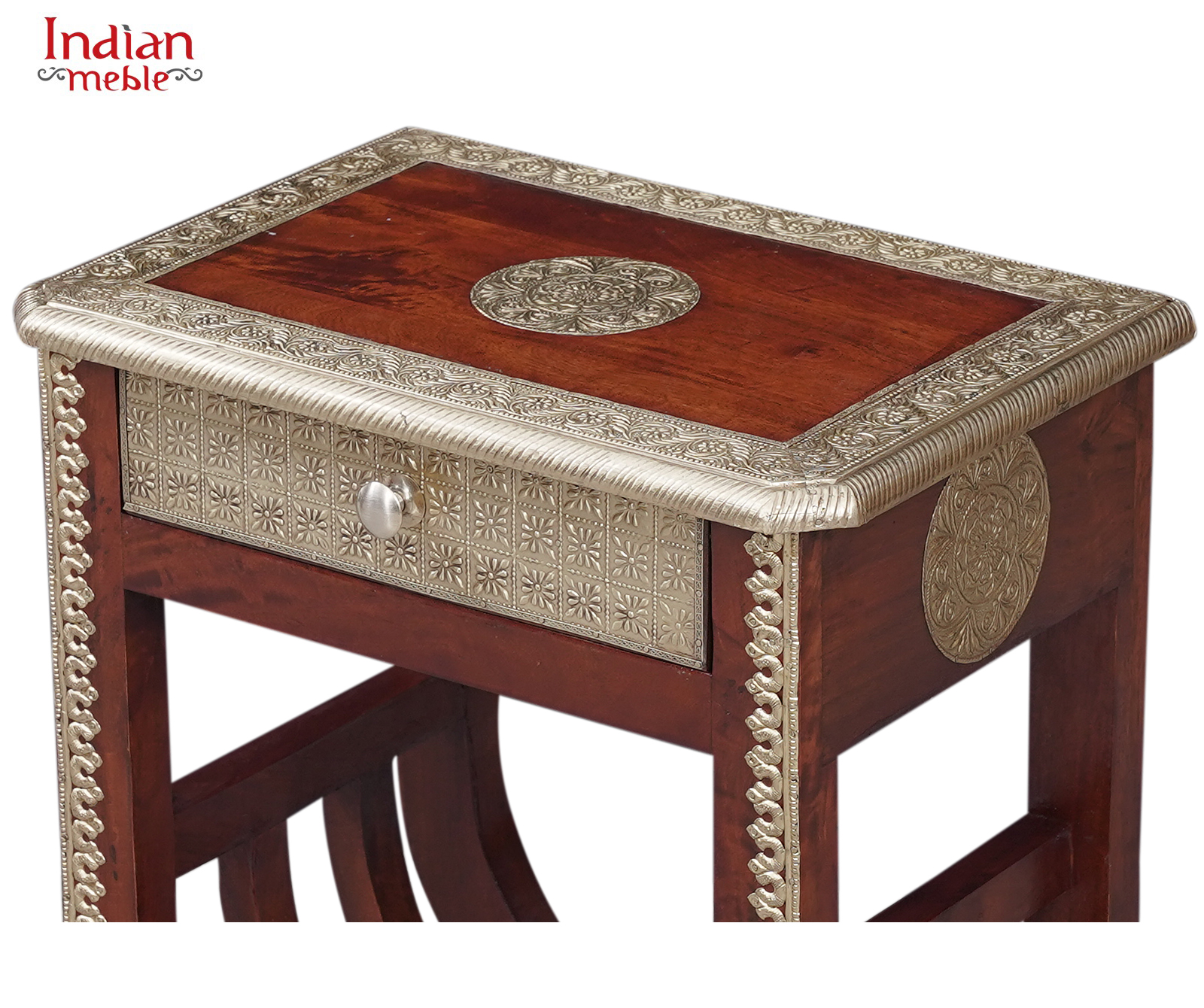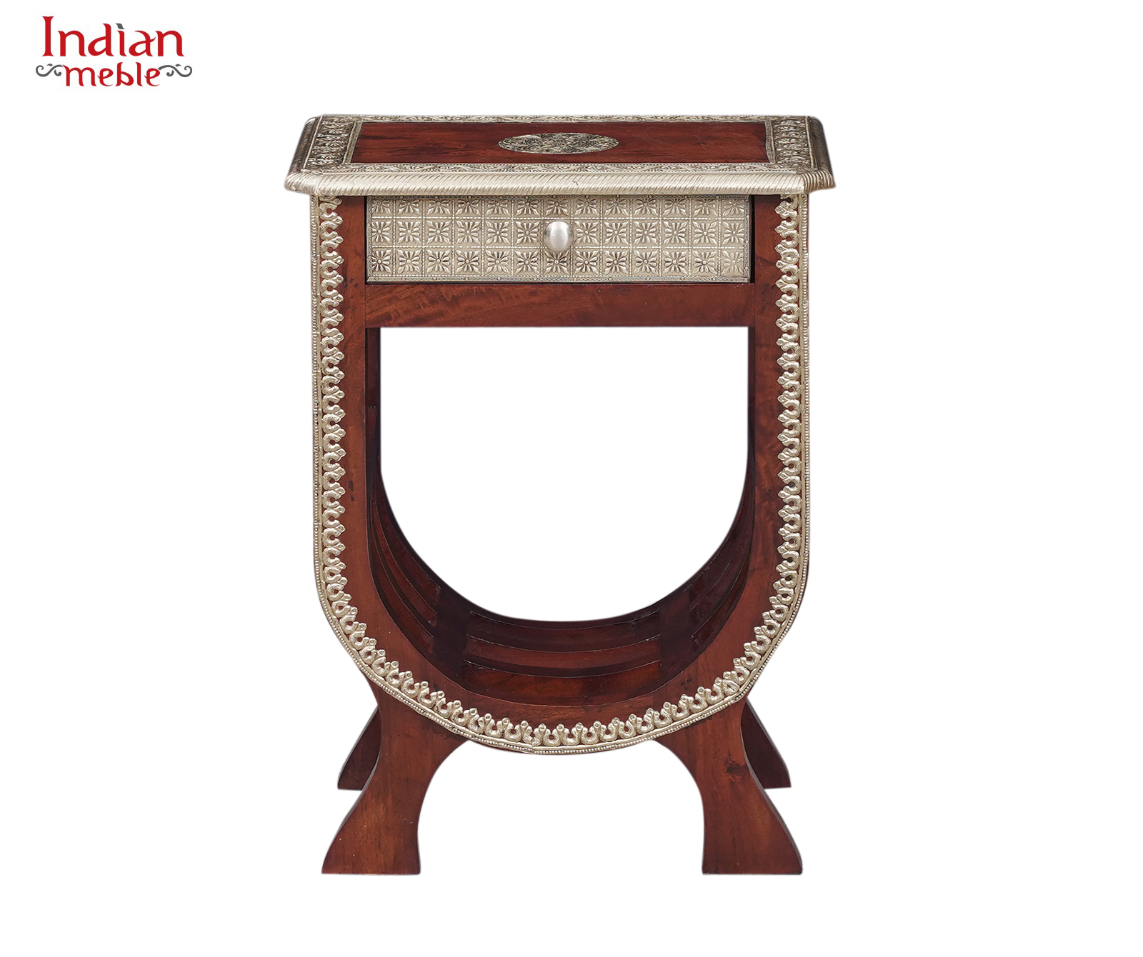 Blat ozdobiony jest centralnym ornamentem, a krawędzie konsoli wykończono dekoracyjną listwą z delikatnym wzorem. Front mebla posiada praktyczną szufladę z ozdobnym uchwytem, która umożliwia przechowywanie drobnych przedmiotów.
