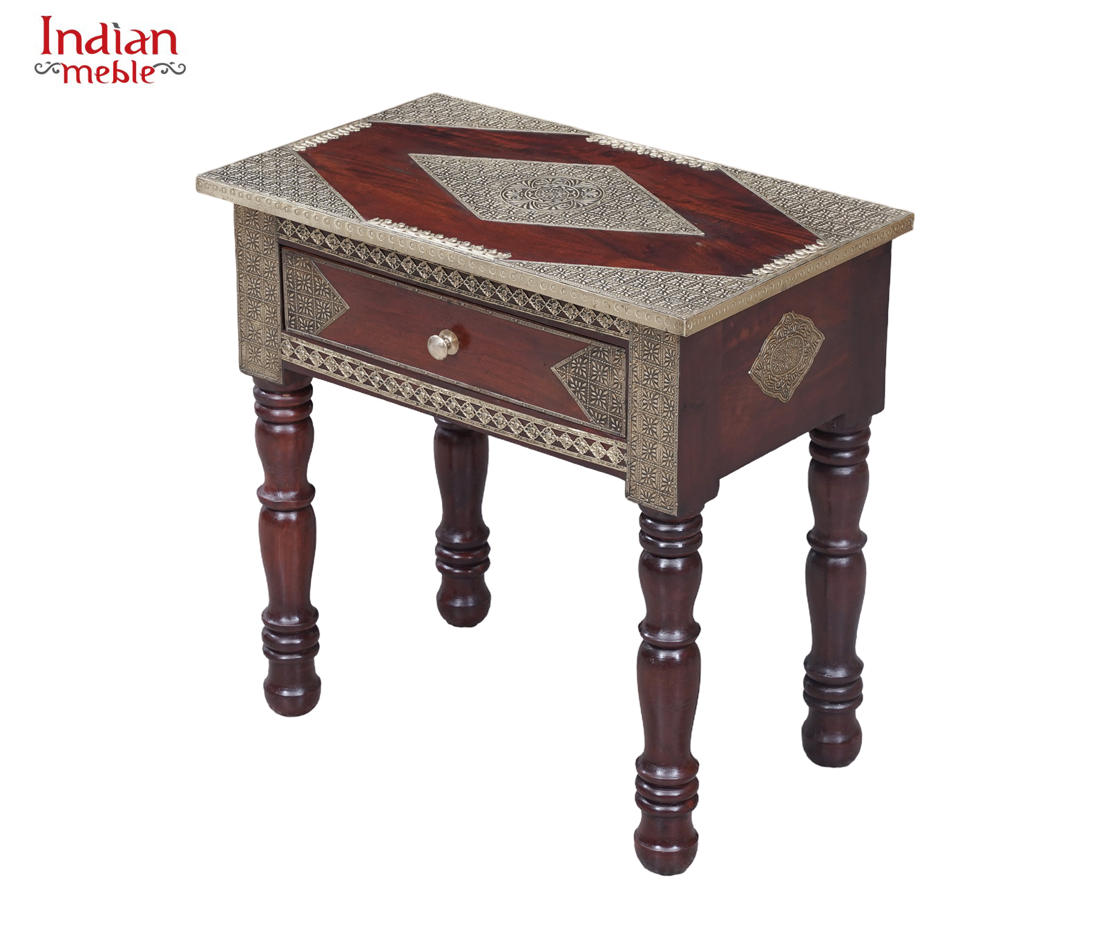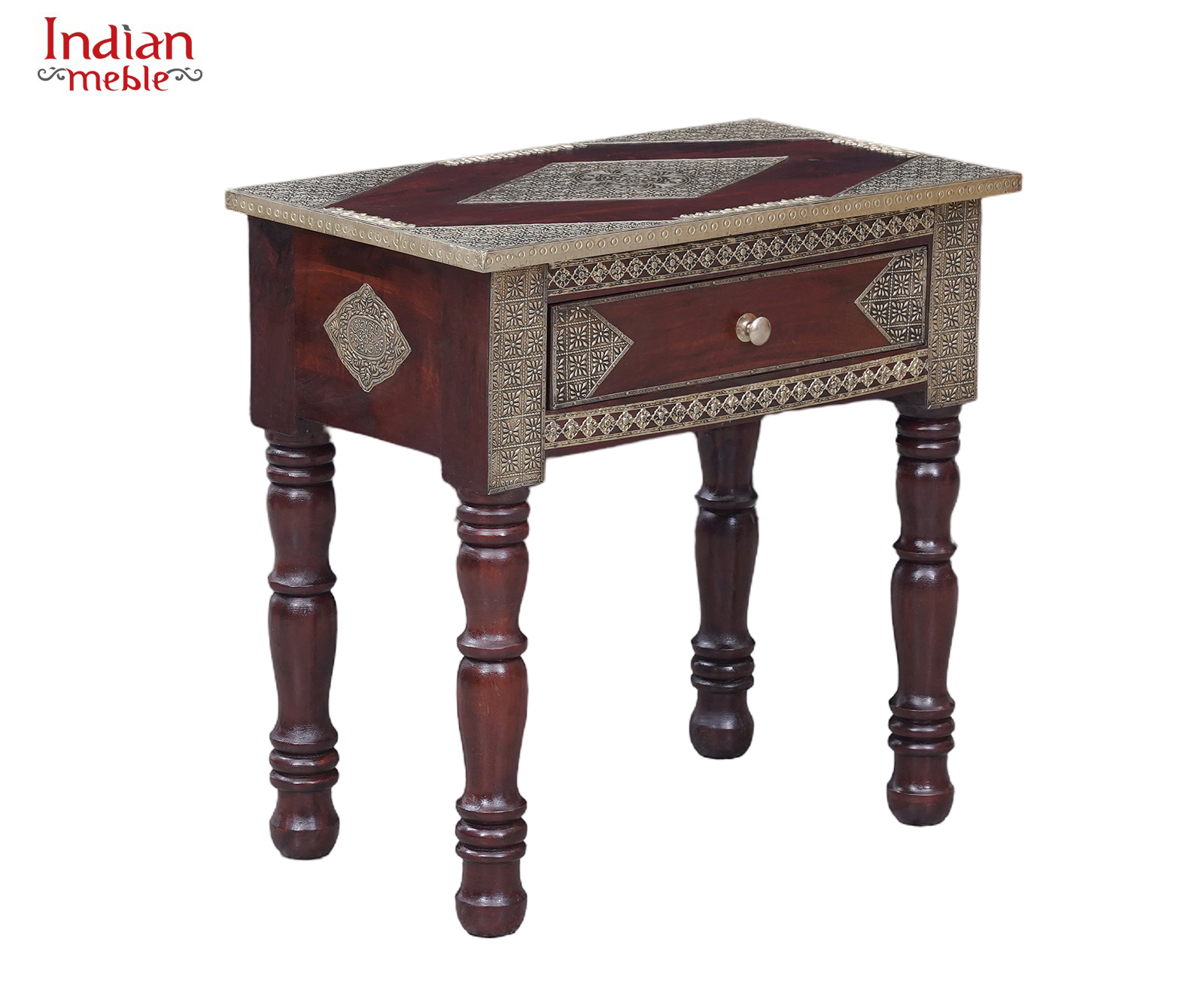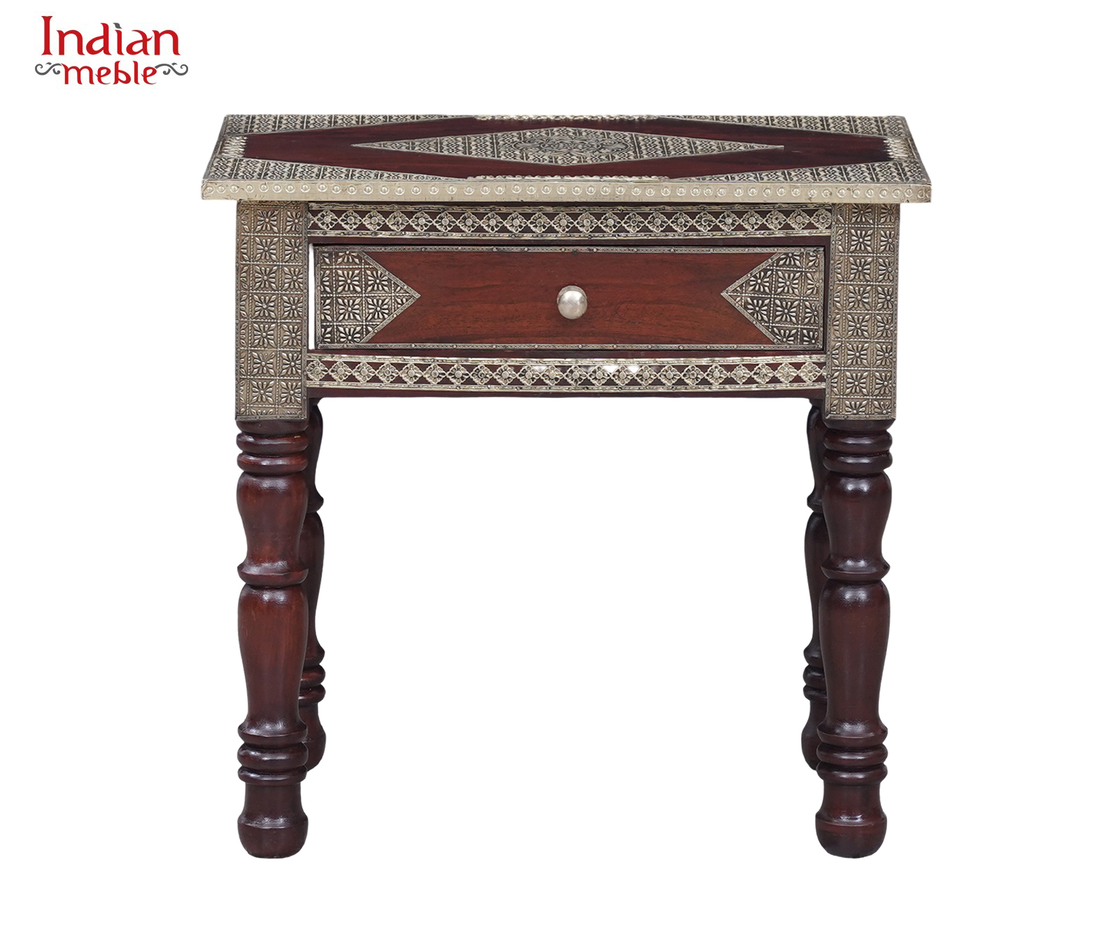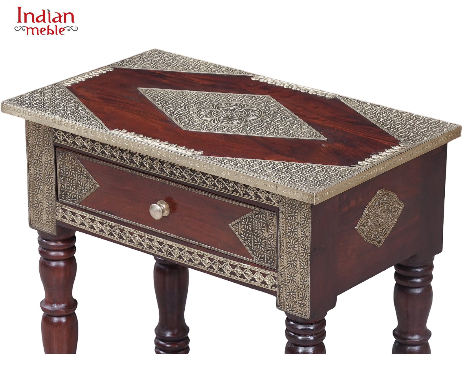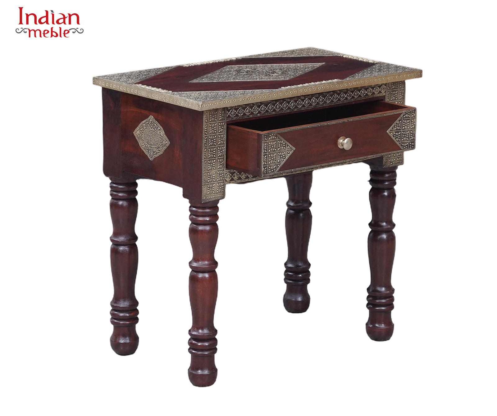 Blat konsoli zdobi geometryczny ornament, a front wyposażony jest w praktyczną szufladę z ozdobnym uchwytem, idealną do przechowywania drobnych przedmiotów. Starannie wykonane dekoracyjne elementy wokół blatu i na bokach nadają meblowi elegancji i niepowtarzalnego stylu.