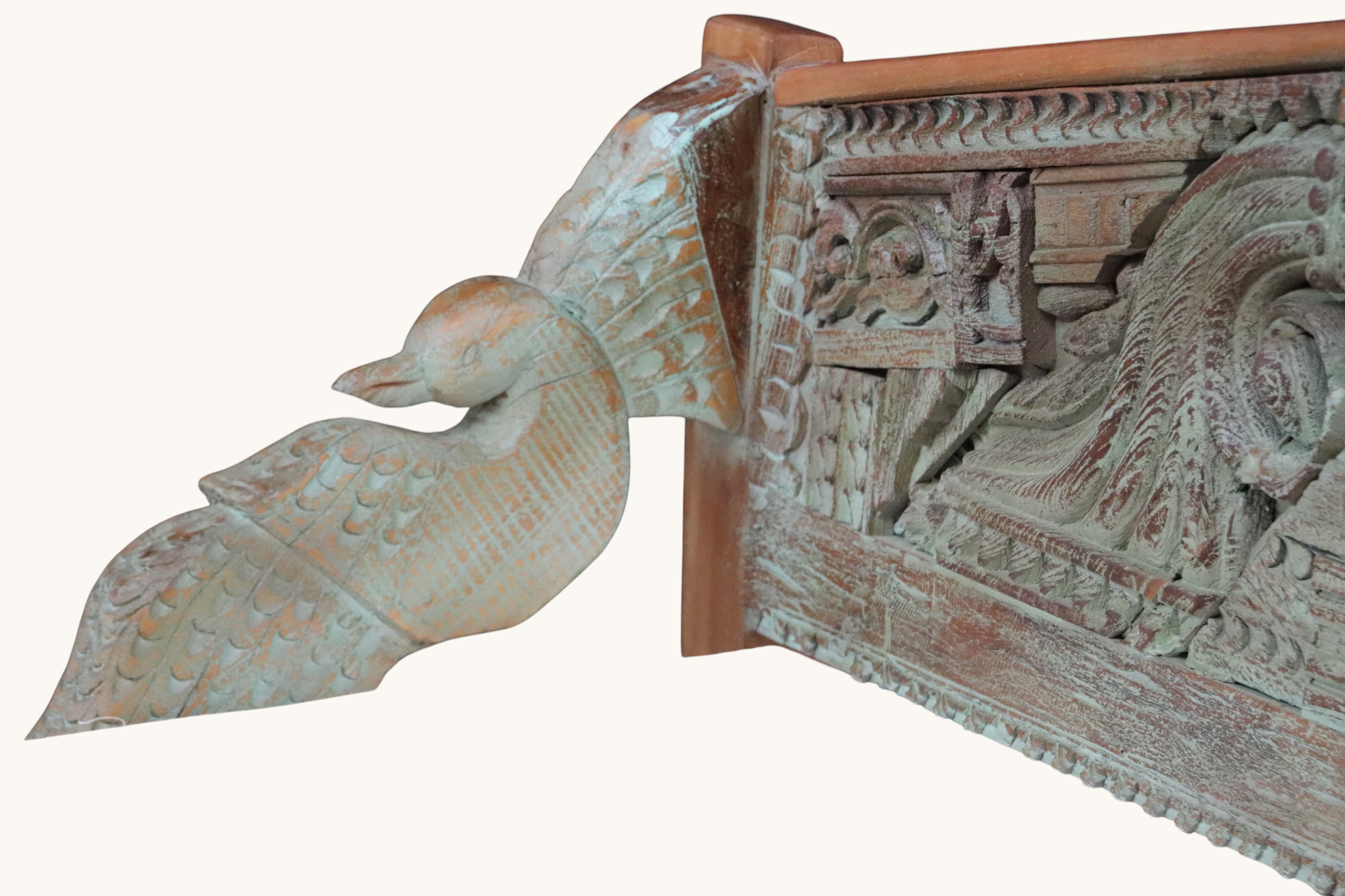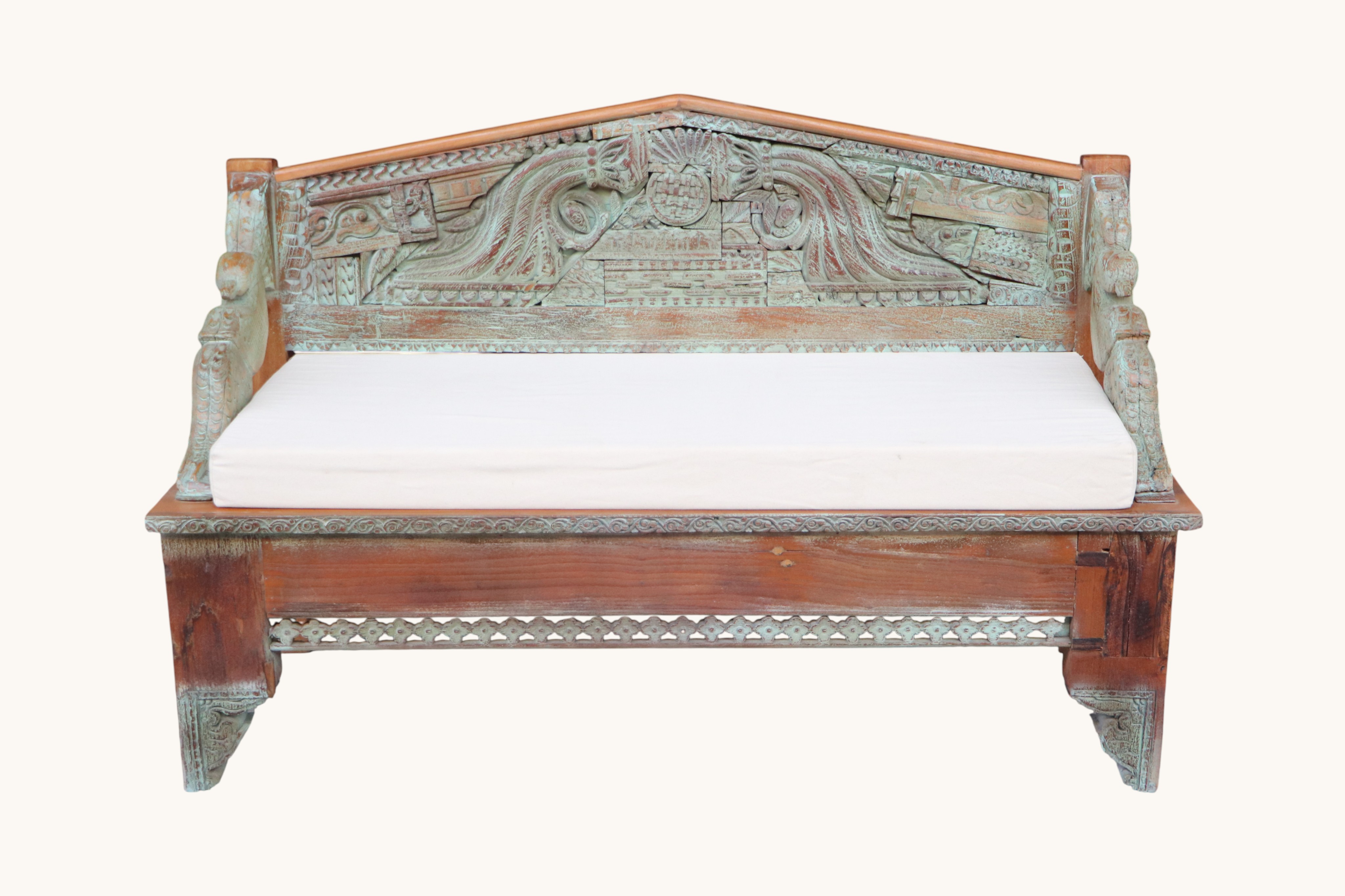 Stylowa ławka wykonana z litego drewna mango, wyróżniająca się bogato rzeźbionym oparciem oraz dekoracyjnymi detalami inspirowanymi tradycyjnym rzemiosłem. Naturalny odcień drewna podkreśla unikalną strukturę słojów i nadaje meblowi ciepły, autentyczny charakter.